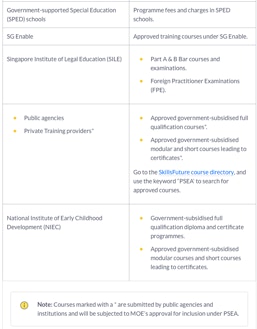 From May 08, a child can use his PSEA funds to pay for his own or his siblings' approved fees and charges for approved programmes conducted by the institutions indicated in the table below.